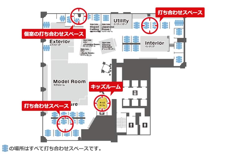 - わ〜、満席ですか! ショールームに来るときに予約が必要な理由がわかりました(笑)。ところで、打ち合わせスペースには個室タイプとオープンなブースタイプがありますよね?