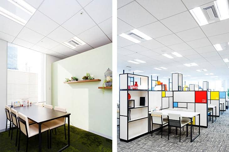 (右)ブースタイプの打ち合わせスペースは、フロアをぐるりと囲むようにたくさん配置されています。