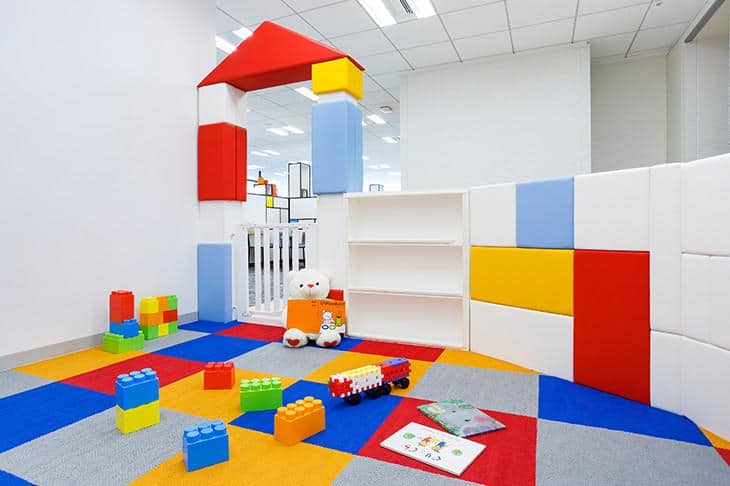 - ここではビデオを見たり、お絵かきしたりもできます。小さなお子様も利用できるように、クッション性のあるパーテーションで囲ってあります。オープンハウスカラーのデザインもポイントです(笑)。