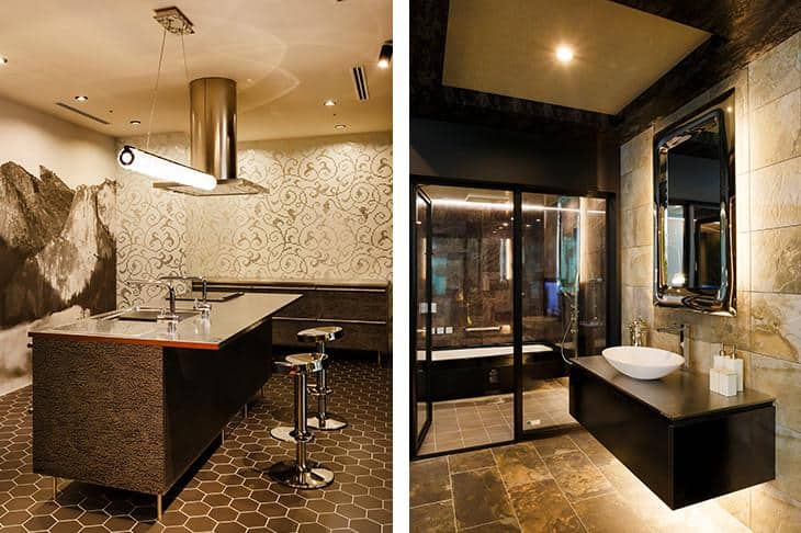 (右)高級ホテルのような、ガラス張りの浴室や間接照明が効いた洗面室。
