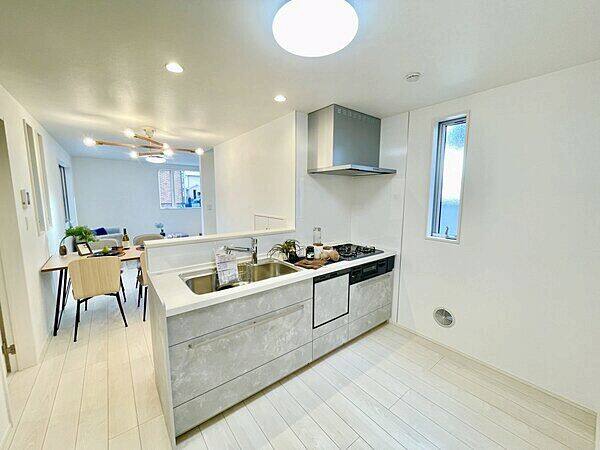 前面道路6m以上/1階にリビング/システムキッチン/対面式キッチン/食器洗乾燥機/浄水器/浴室乾燥機/浴室1坪以上/シャワー付洗面台/トイレ2ヶ所/温水洗浄便座/ガスコンセント/アクセントクロス/複層ガラス/北東側隣地通路/都市ガス/公共水道/公共下水