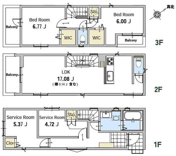 - 略式凡例/RC=鉄筋コンクリート、SRC=鉄骨鉄筋コンクリート、SERVICE ROOM=納戸、SB=セットバック、P=駐車スペース、WIC=ウォークインクローゼット、W=洗濯機置場、R=冷蔵庫置場、WC=トイレ、CLO=クローゼット、STO=保管庫、VOID=吹抜、ENT=玄関