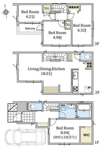 - 略式凡例/RC=鉄筋コンクリート、SRC=鉄骨鉄筋コンクリート、SERVICE ROOM=納戸、SB=セットバック、P=駐車スペース、WIC=ウォークインクローゼット、W=洗濯機置場、R=冷蔵庫置場、WC=トイレ、CLO=クローゼット、STO=保管庫、VOID=吹抜、ENT=玄関