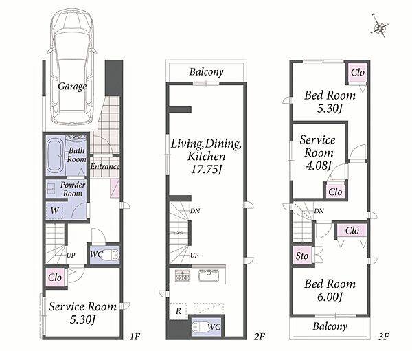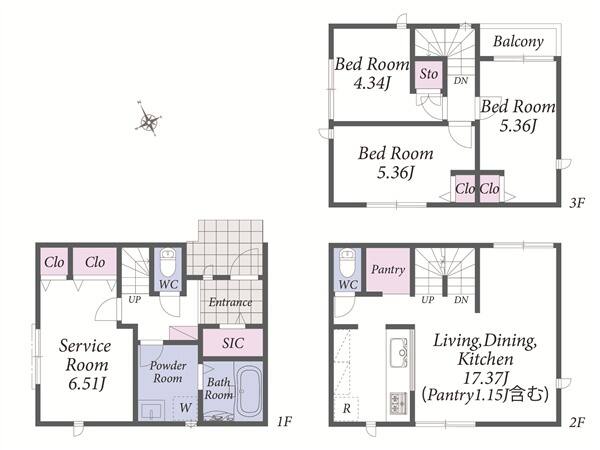 - 略式凡例/RC=鉄筋コンクリート、SRC=鉄骨鉄筋コンクリート、SERVICE ROOM=納戸、SB=セットバック、P=駐車スペース、WIC=ウォークインクローゼット、W=洗濯機置場、R=冷蔵庫置場、WC=トイレ、CLO=クローゼット、STO=保管庫、VOID=吹抜、ENT=玄関