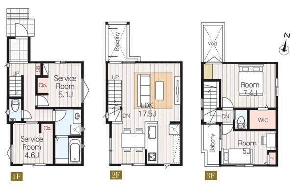 - 略式凡例/RC=鉄筋コンクリート、SRC=鉄骨鉄筋コンクリート、SERVICE ROOM=納戸、SB=セットバック、P=駐車スペース、WIC=ウォークインクローゼット、W=洗濯機置場、R=冷蔵庫置場、WC=トイレ、CLO=クローゼット、STO=保管庫、VOID=吹抜、ENT=玄関