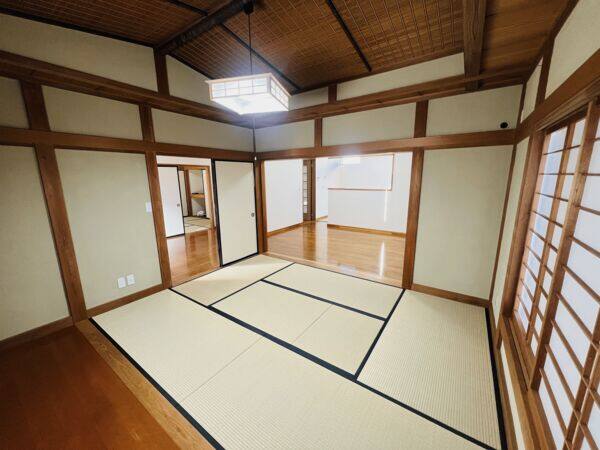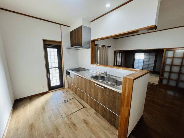建物面積広々170m2超。LDKは対面式キッチン採用。木造平屋建ての私邸。