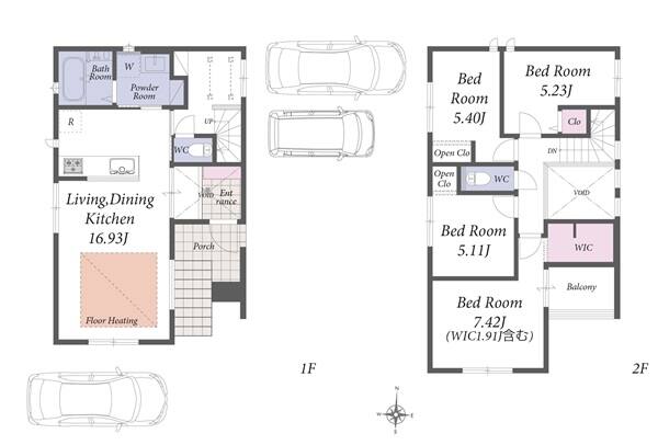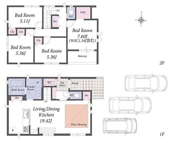 お車3台駐車可能。ウォークインクローゼット付きの2階建て新築分譲住宅です。