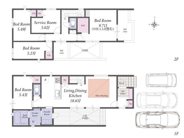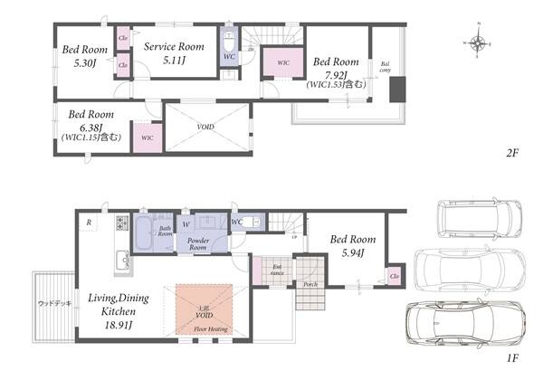 カースペース並列3台駐車可能。ウッドデッキ付きの新築分譲住宅です。