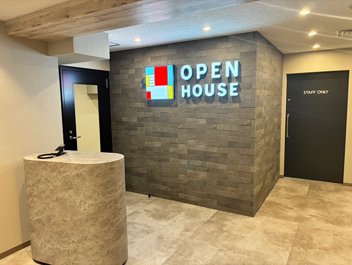 道沿いに進んで右折した先に入口があります。エレベーターで2階へ上がり受付の電話よりスタッフをお呼びください。