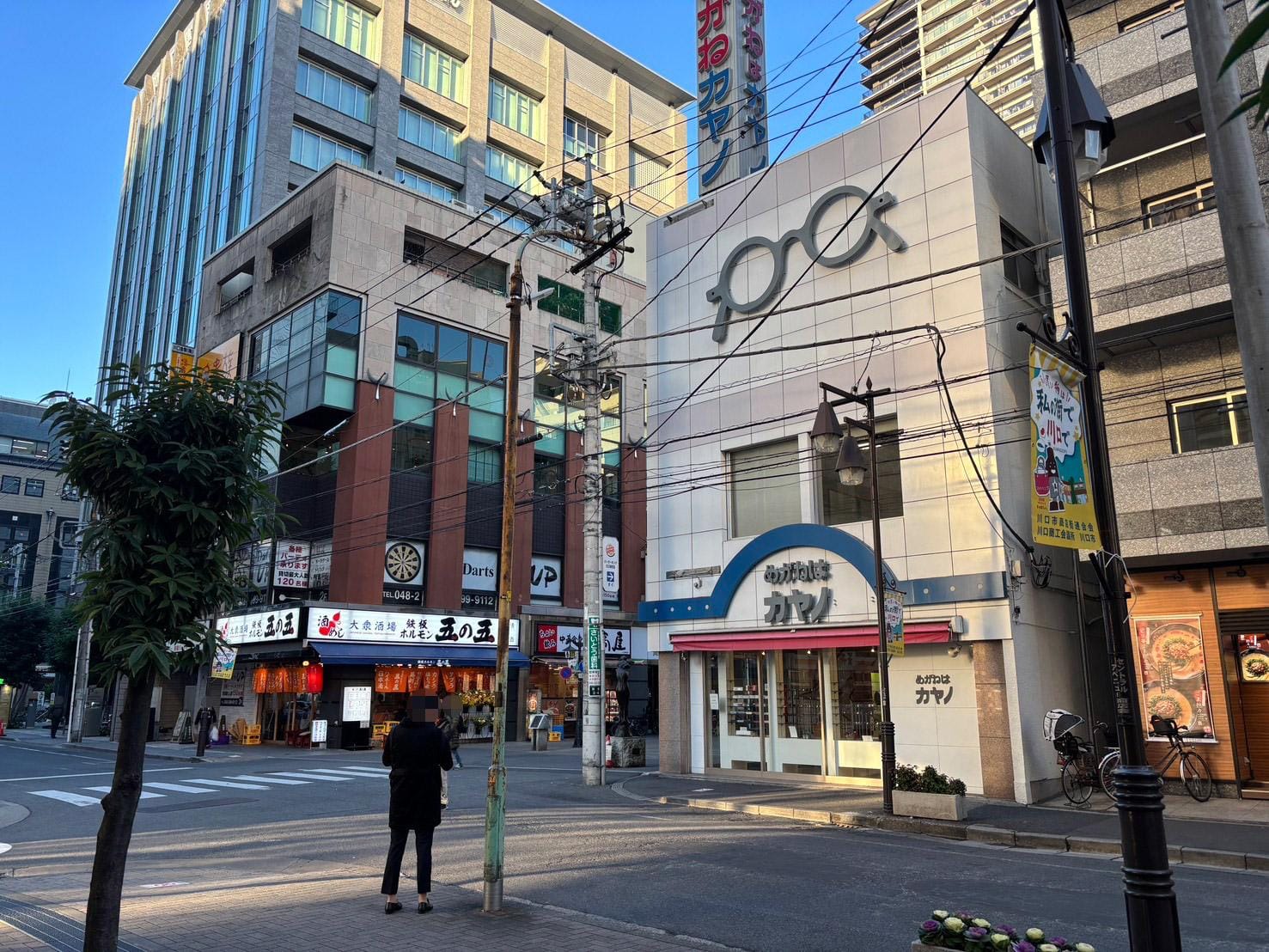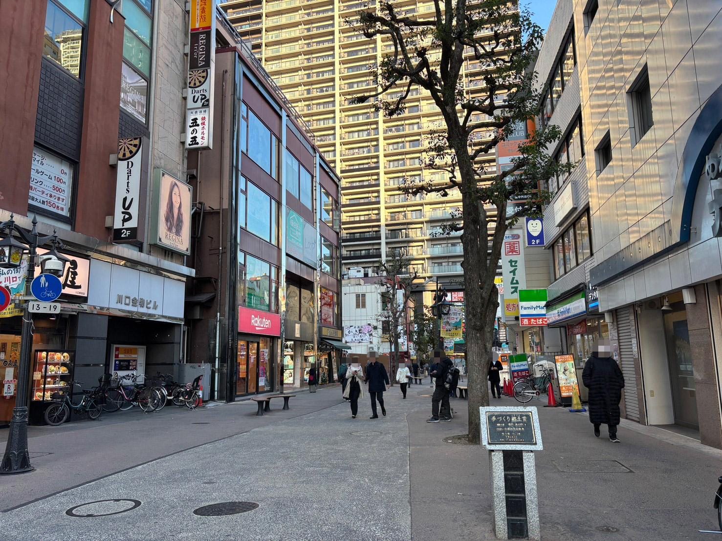 地上に降りると、左斜め前方に商店街の入口があります。 眼鏡屋さんを目印にお進みください。